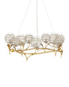 The Dandelion Silver & Gold Chandelier is a masterful composition that celebrates its namesake flower. The puff-balls that surround the bulbs are made of nails that are bent and welded together, a process that is extremely labor intensive. Made of wrought iron, the chandelier's undulant rings, orb accents, and leaves are in a contemporary gold leaf finish, while the floral elements are in a mix of contemporary silver leaf and contemporary silver finishes. This special piece expressively celebrates nature.
