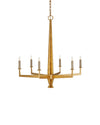 The Goldfinch Medium Chandelier is a complex geometrical puzzle that is worked one arm at a time. Each of the pieces of wrought iron is forged individually and welded to the frame to create the articulating profile. The statuesque fixture has a washed Lucerne gold finish, which has a slight texture to it because it is splattered on after the chandelier is constructed. The shades shown here are sold separately.