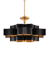 The Grand Lotus Black Large Chandelier receives its majestic good looks from a combination of stunning workmanship and a mix of satin black and contemporary gold leaf finishes. The black chandelier is skillfully fashioned from wrought iron.