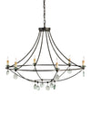 The Novella Chandelier showcases timeless craftsmanship and a creative use of materials. Recycled glass, which takes on a sheen when light strikes it, was used to create the bobeches and disks that adorn the black chandelier. The wrought iron frame in a Mayfair finish has an anchoring effect.