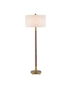 The Bravo Floor Lamp is a simple design made of rubberwood in a mahogany finish that is capped top and bottom by metal details in an antique brass finish. The finial is also made of rubberwood in a mahogany finish. It fastens the off-white linen shade to the wood floor lamp.