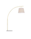 The angular arc of the stem on the Cloister Brass Large Floor Lamp, the way the shade dangles, and the minimal shape of its base are design details that make it an exemplar of contemporary design. The clean way the stem is fastened to the base and the pared-down lines of the white linen shade enhance the gold floor lamp's modernity. The acrylic diffuser fastened by the petite button finial is a clever aspect to this design.