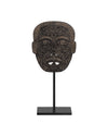 The Han Dynasty Jade Medicine Mask, which is made of a bronze-colored stoneware, emulates a famed jade carving and sits atop a metal stand in a black finish. During the bygone era for which it is named, a mask like this would be placed on the chest of doctors and healers during medical treatments because it was thought to ward off evil spirits. The rich brown sculpture is carved on the front and the back.