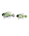 The Rialto Green Glass Fish Set includes large and small glass sculptures created in the Venetian tradition of glassblowing. The green fish sculptures require special tools to twist certain aspects of the pieces when the glass is beginning to thicken, such as the tails and the lips. The fins are added by hand, a precise effort that takes great skill and experience in order to know when the glass is the perfect temperature so that they will adhere rather than melt. Each piece will have slight variations, which makes these green decorative accessories unique.