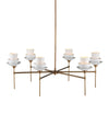 The Etiquette Chandelier is a mid-century-modern inspired chandelier made of metal in an antique brass finish. The telescoping stems hold semi-transparent bone china cups in graduating shapes that resemble tea cups. The luminous material softens the light that reflects from within. This gold chandelier was designed by Ian Thornton to be an uplight fixture with glowing shades.
