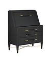 The Verona Black Secretary Desk is darkly handsome covered in black lacquered linen with metal detailing in a champagne finish. The stretchers on this black desk create added interest to enhance its flair. The beautifully detailed drawer pulls, which are wrapped in matching material in the middle and left bare on each end, grace each drawer with their metallic sheen. The top folds down on this classic piece to reveal a desktop, a center-adjustable shelf, two fixed shelves, built-in power outlets, and two USB ports. Aimee Kurzner designed the chic piece that also has three large drawers.